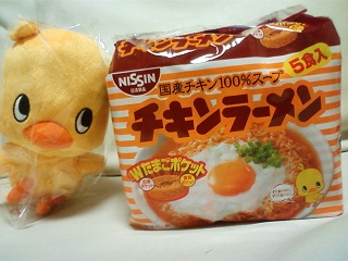 ひよこちゃんぬいぐるみとチキンラーメン5食パック、