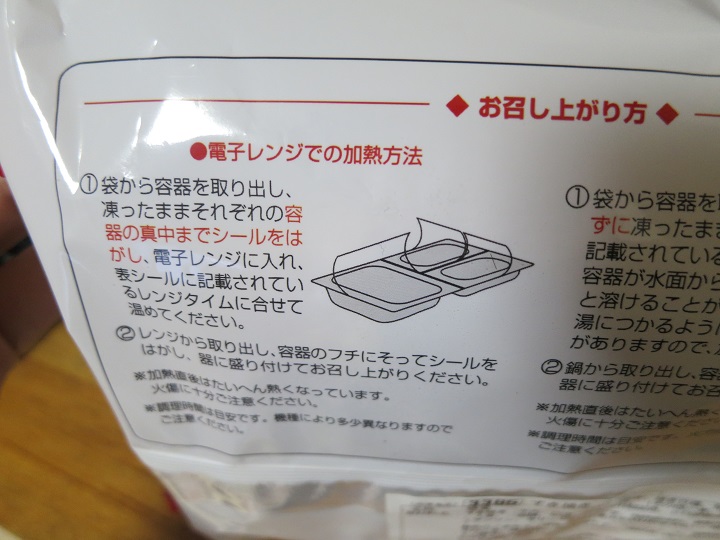 そのまま湯煎か密着フィルムを半分くらい開けて電子レンジで解凍すれば出来上がり。