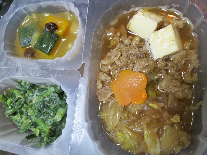 商品の内容は、「とうふハンバーグ」「さけのちゃんちゃん焼き」「すき焼き」の