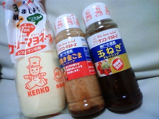 ケンコーマヨネーズ&玉ねぎドレッシング&粗挽き金ゴマドレッシングの3本。