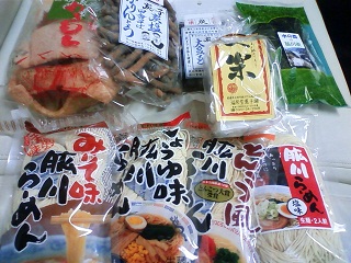 ラーメン4種類、かきもち、かりんとう、飴、もなか、お茶が入りのとても豪華なプレゼント!