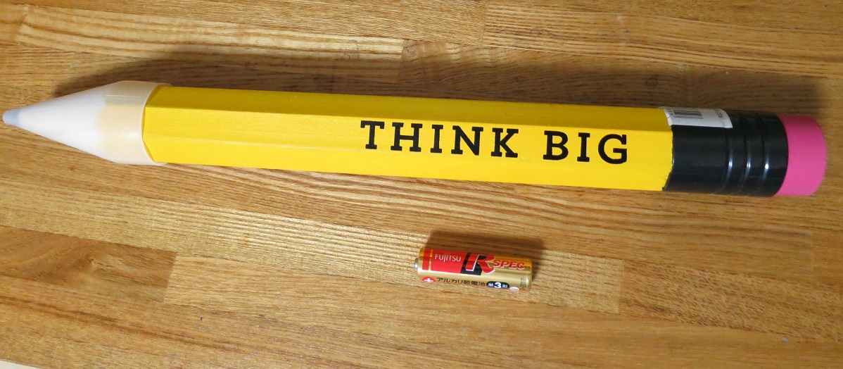 乾電池と並べてみました。長さが37センチくらいあるかなり大きい鉛筆です。