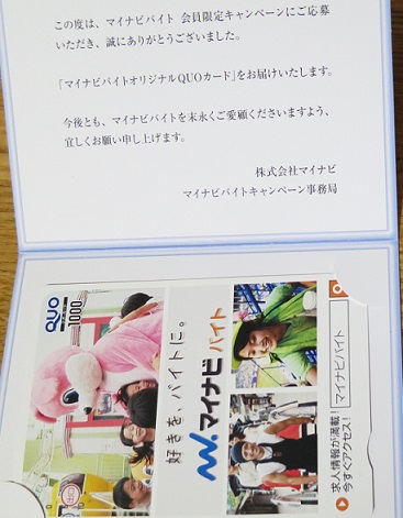 マイナビバイトさんからQUOカード1000円