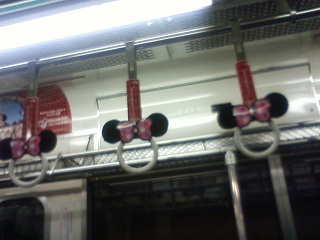 有楽町線に乗ったら電車内のつり革が全部ミニーちゃんになってたよ♪可愛い~♪